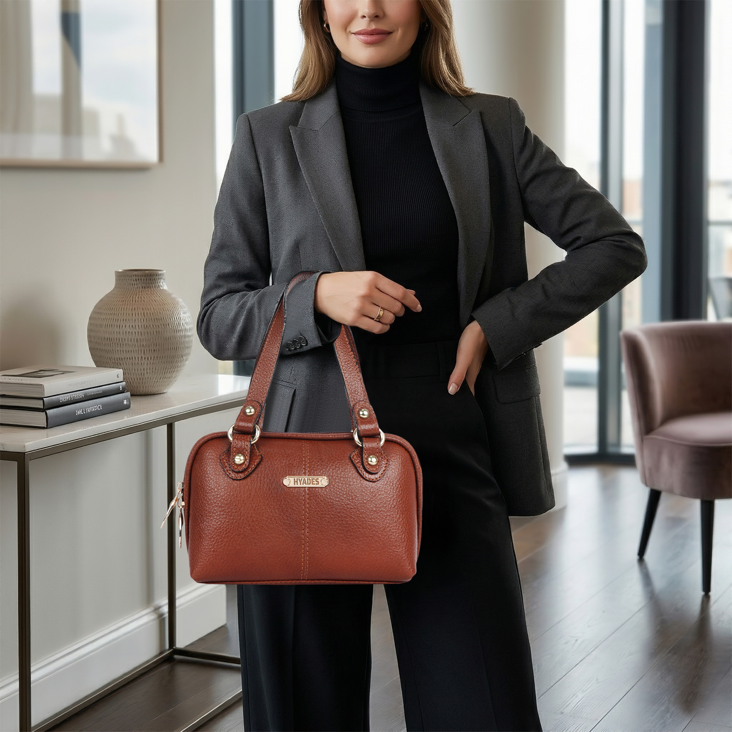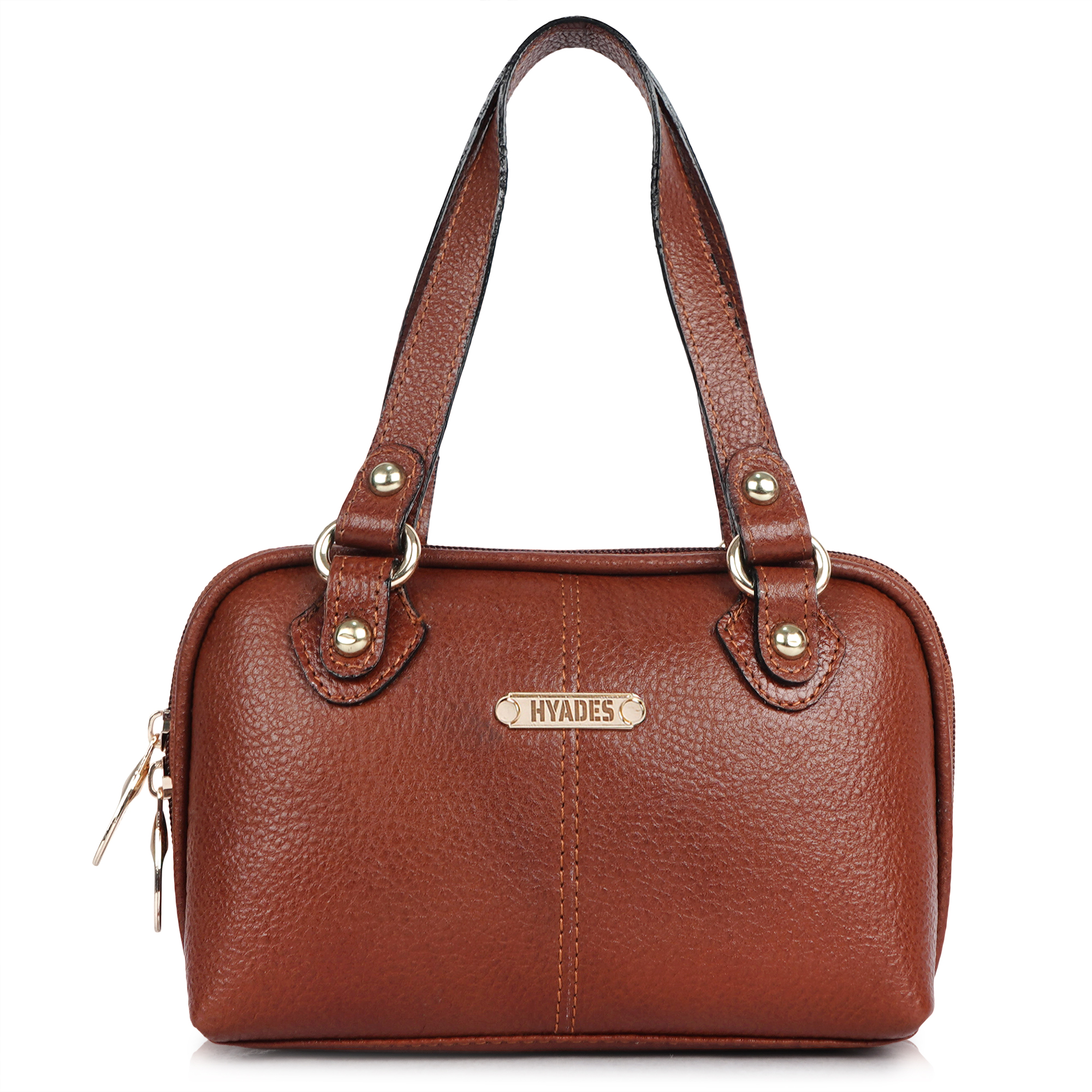 HYADES Classic Textured Leather Top Handle Shoulder Handbag | TAN