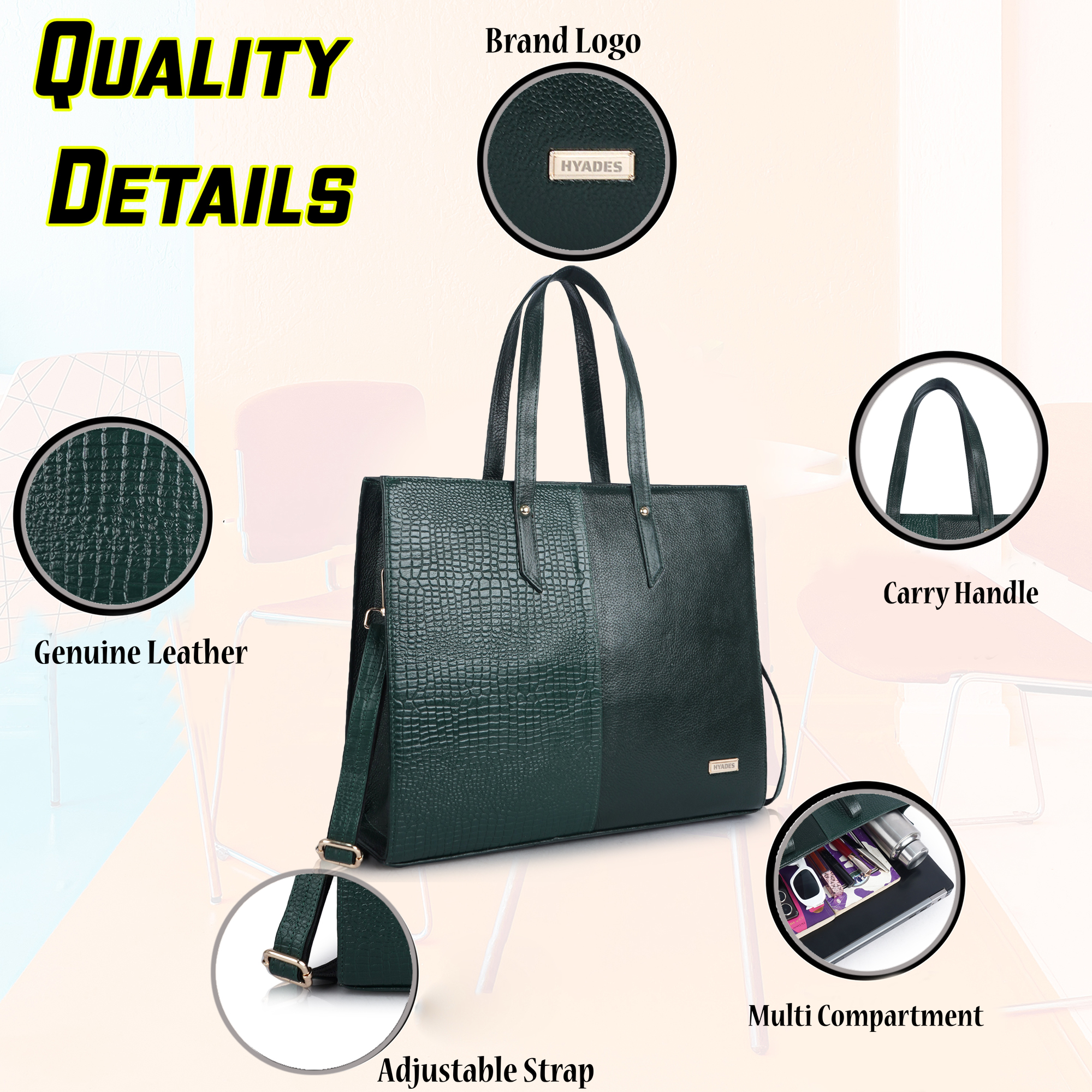 HYADES-TOTE BAG-pure leather tote bag for women-15inch laptop compatible-detachable sling-separate compartment for laptop-GREEN