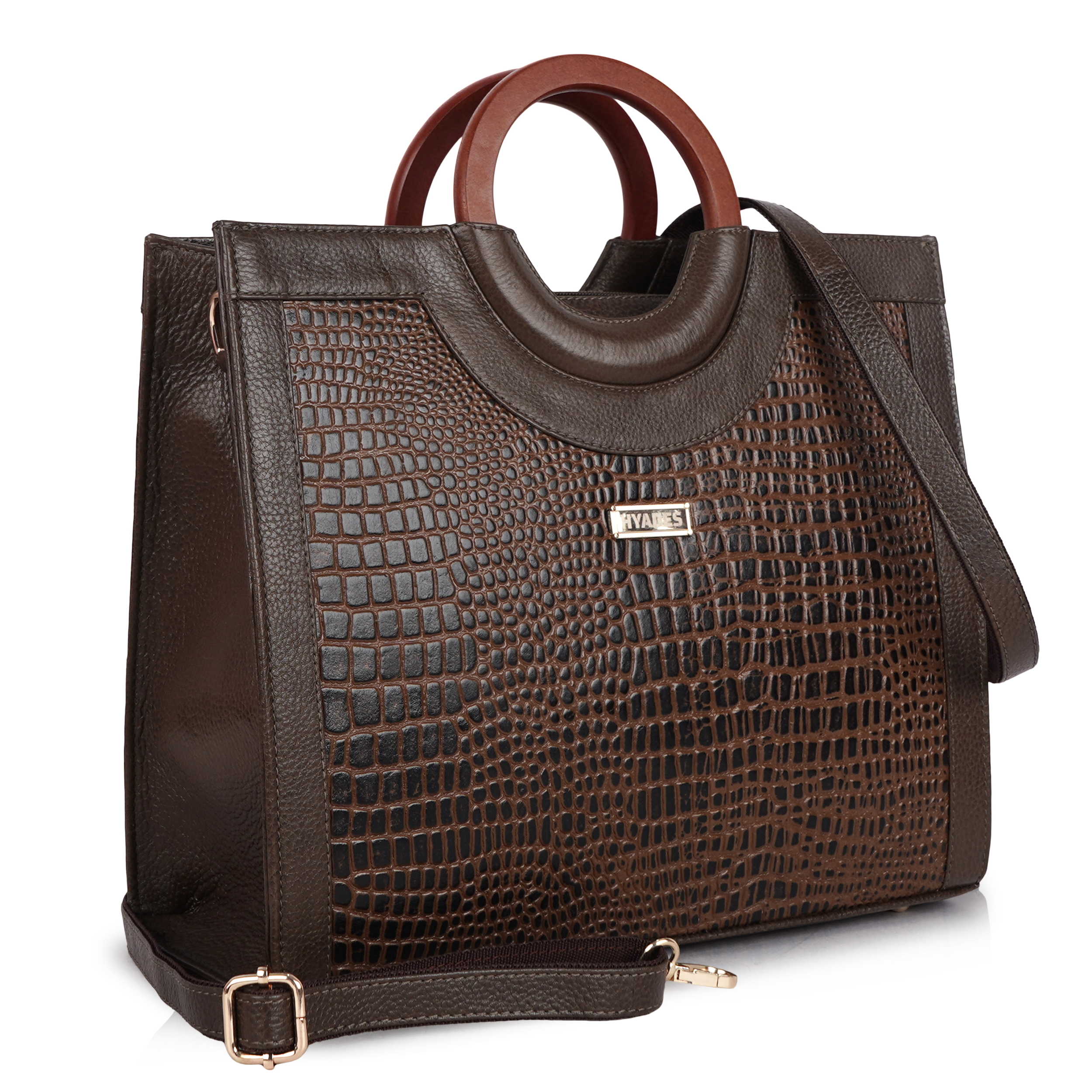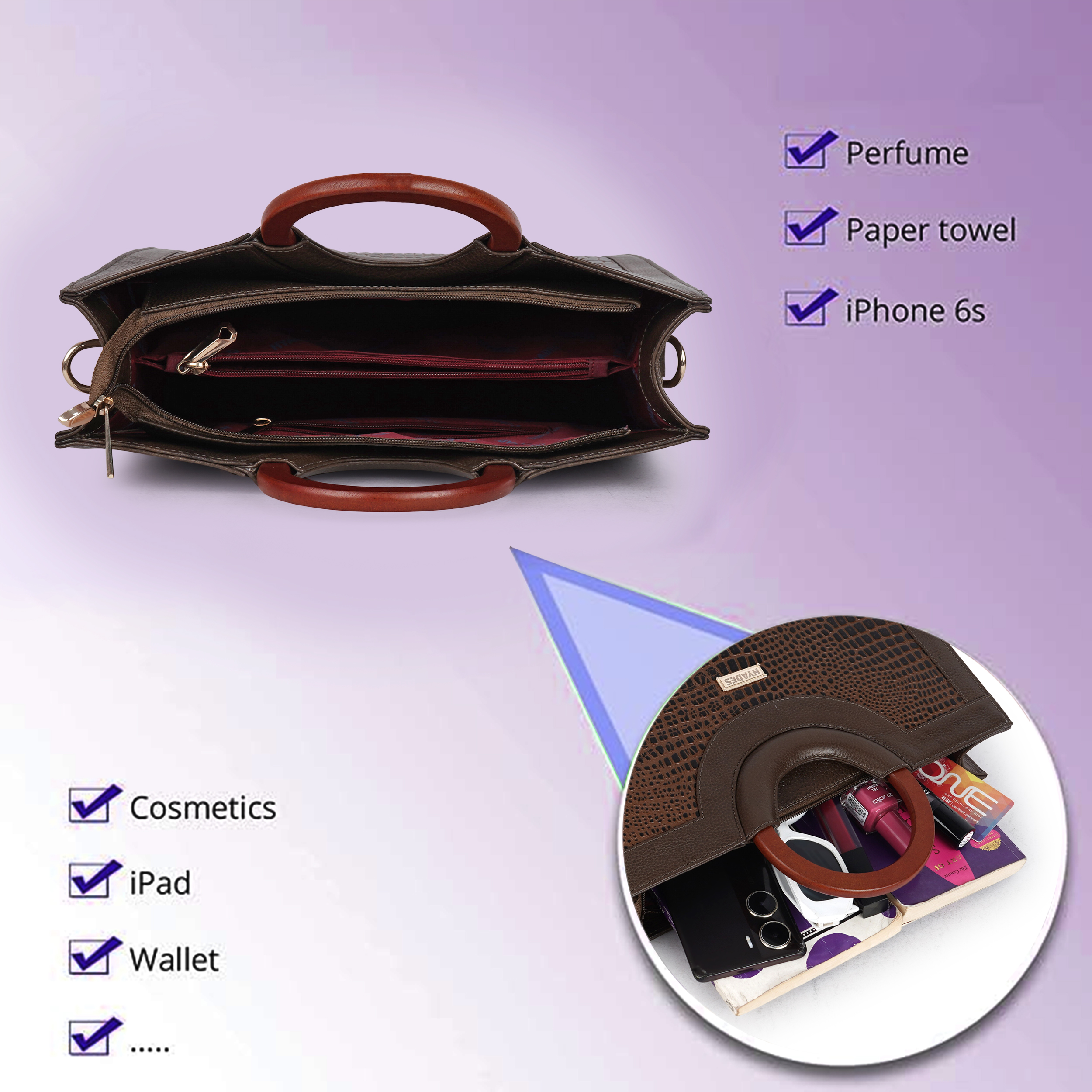 Women Croco Texture Handbag | Premium Top Handle Tote Bag with Detachable Sling Strap | Stylish Office & Party Bag | COFFEE BROWN